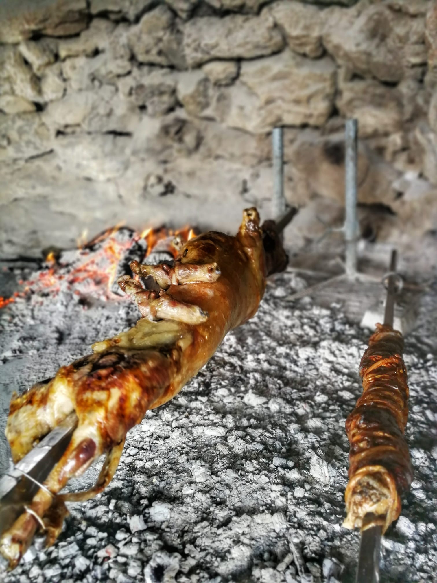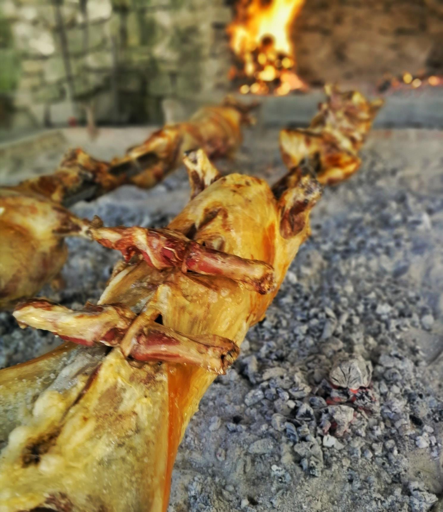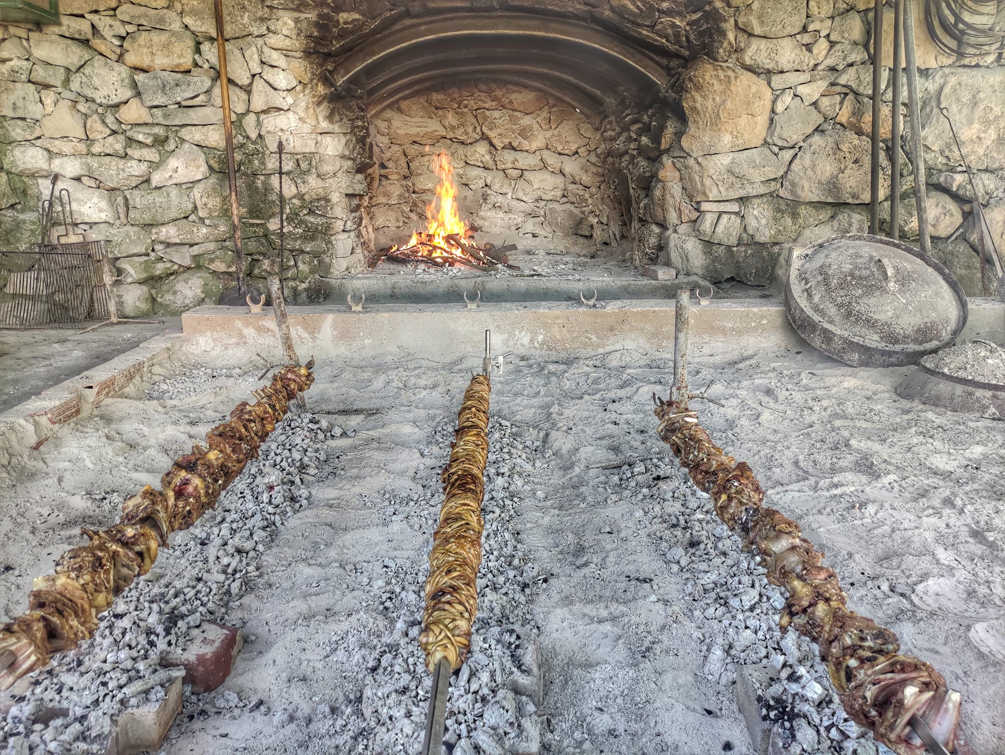 Vitalac – lamb’s offal; liver, heart and lungs skewered and wrapped in lamb’s skin, turned on coals — lamb on stick — seasonal vegetables from the garden as a main course.